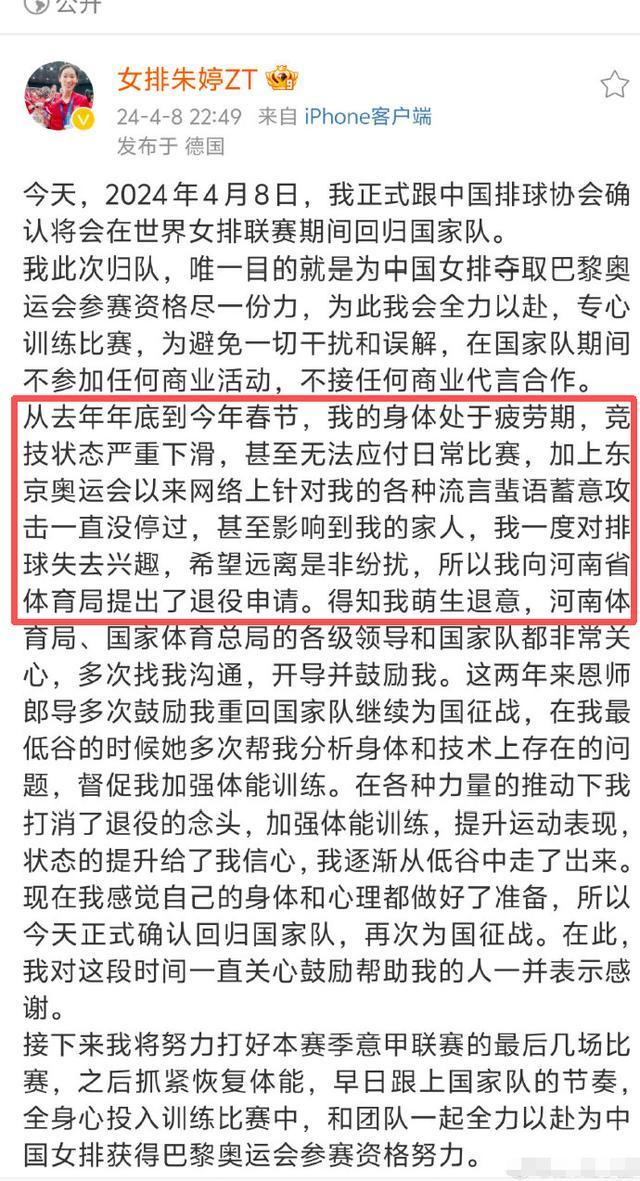 2024年4月8日,朱婷在经历了几年的网暴之后,在个人社交平台上发布长文。