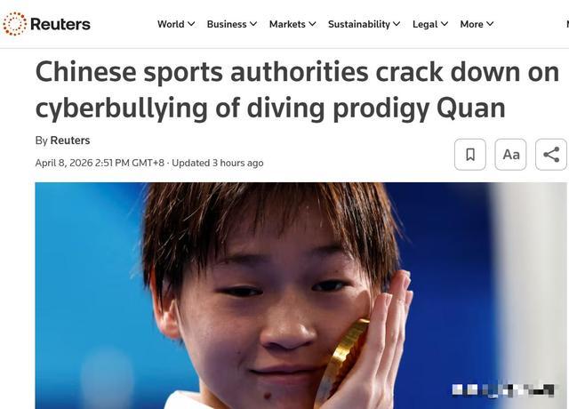 路透社率先发声,以《中国体育主管部门严厉整治针对跳水天才全红婵的网络霸凌》为题,报道了这场恶意网暴。